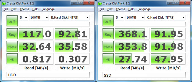 ランダムアクセスがHDDと比較してSSDが非常に早いのがわかります。SSDの最大転送速度が368.1MB/sでSATA2.0の理論値300MB/sを超えているのでSATA3.0で接続した甲斐があります。